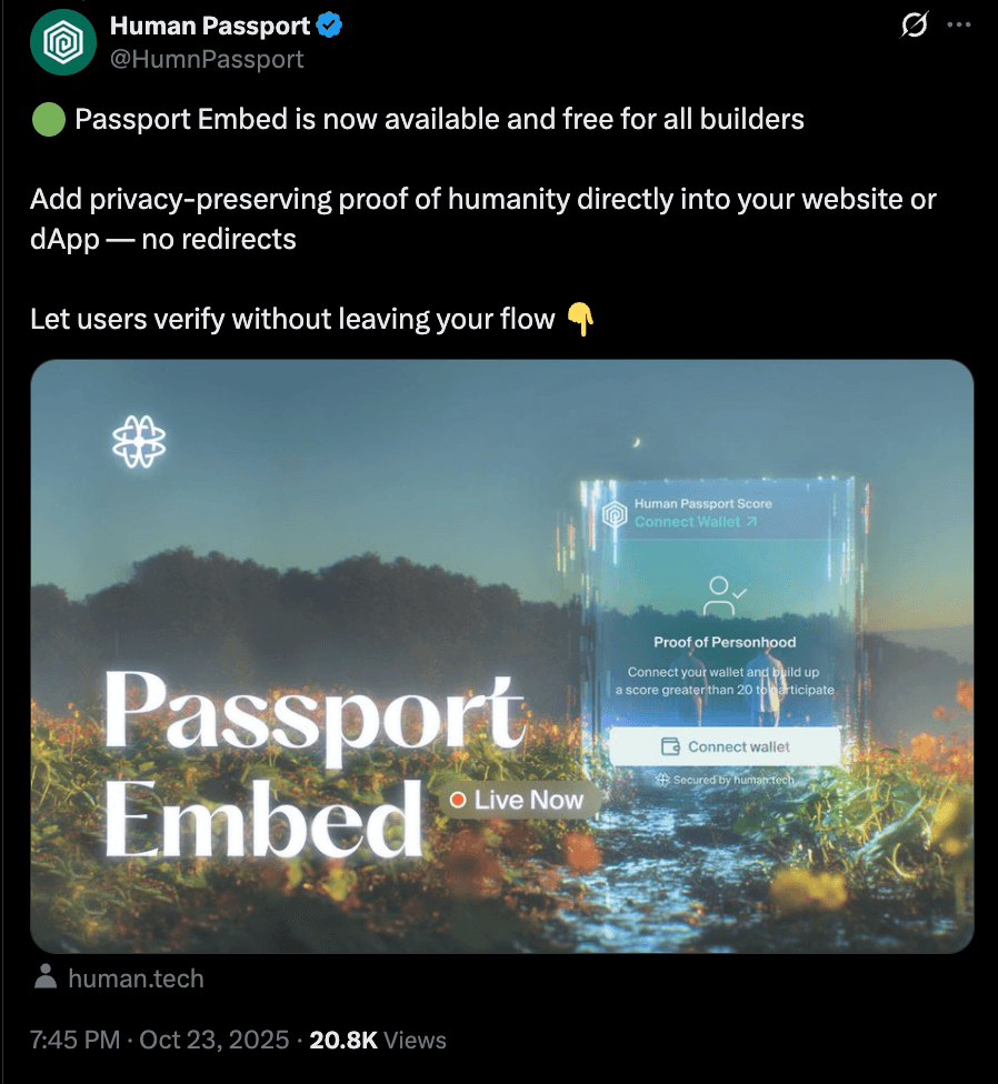 Continued adoption: embeddable flow for in-app verification, improving completion rates, and reducing friction. Passport Embed brings serious UX improvements and is now the default way of using Passport Stamps. Learn more