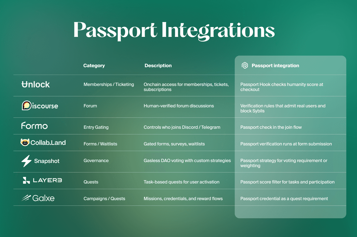 You can also access Passport through products that already integrate it. These tools use our scoring or verification inside their own flows, so you can benefit from humanity checks without building an integration yourself. Below is the full list.
