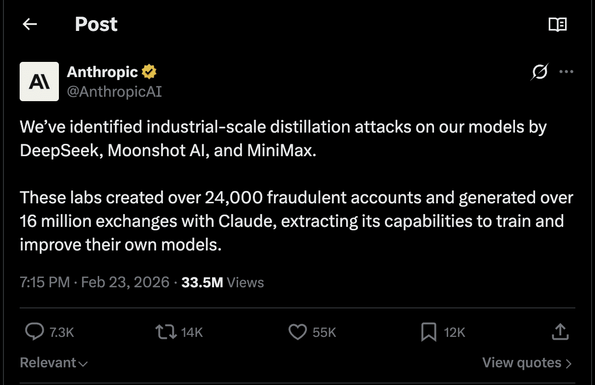 If you follow AI news, you've already heard about this problem. Because this already showed up at scale. A few weeks ago, Anthropic revealed that three Chinese AI labs (DeepSeek, Moonshot AI, and MiniMax) used roughly 24,000 fake accounts to generate over 16 million exchanges with Claude, extracting its capabilities to train their own models. The accounts were created through massive proxy networks designed to look like real users. Anthropic couldn't tell until they caught the pattern post-interaction.