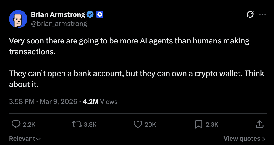 An AI agent can't open a bank account. It can't pass KYC. It has no legal identity. Our entire traditional financial system was designed for humans, businesses, and governments. If you're not one of those three, you can't hold money. As Brian Armstrong recently put it: "Very soon there are going to be more AI agents than humans making transactions. They can't open a bank account, but they can own a crypto wallet. Think about it."