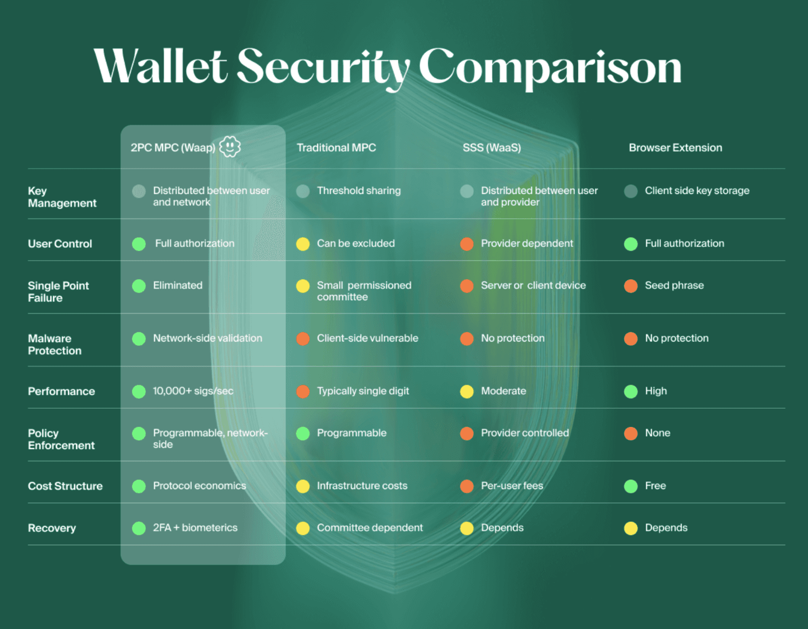 This is the breakthrough Wallet as a Protocol (WaaP) brings through 2PC MPC. Its unique design makes transactional security programmable at the protocol level, with bank-like fraud protection, full user authorization, web2-like flexible access controls, and trustless security policies that can be fine tuned based on business operation.